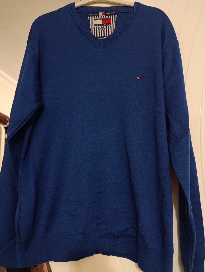 Uzun kollu, yuvarlak yaka, bol kesim erkek triko kazak, parlak mavi yumuşak örme kumaştan, günlük rahat sokak stili için uygundur.