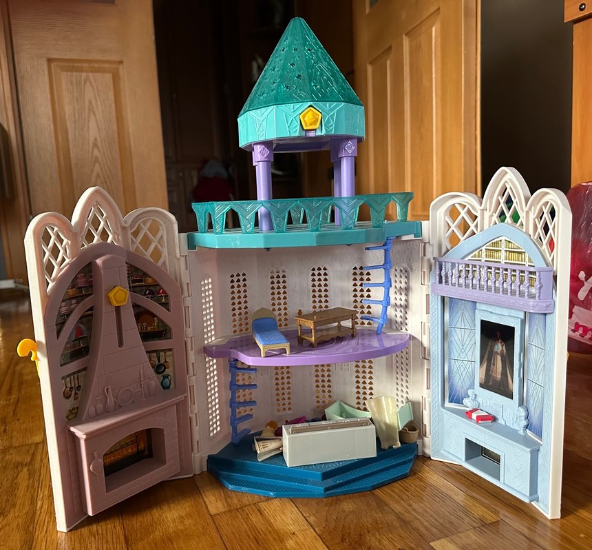 Mavi renkli, açılabilir yanları ve çok katlı yapısıyla eğlenceli bir oyun evi oyuncak