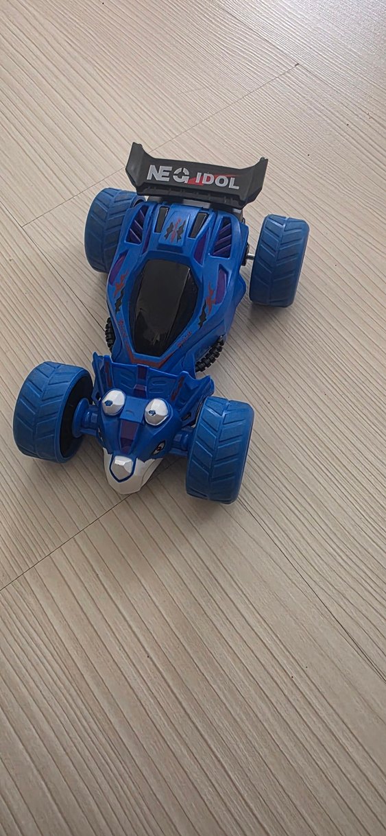 Renkli mavi oyuncak araba, büyük tekerlekleri ve NE-CIDOL yazılı kanadıyla dikkat çekiyor.