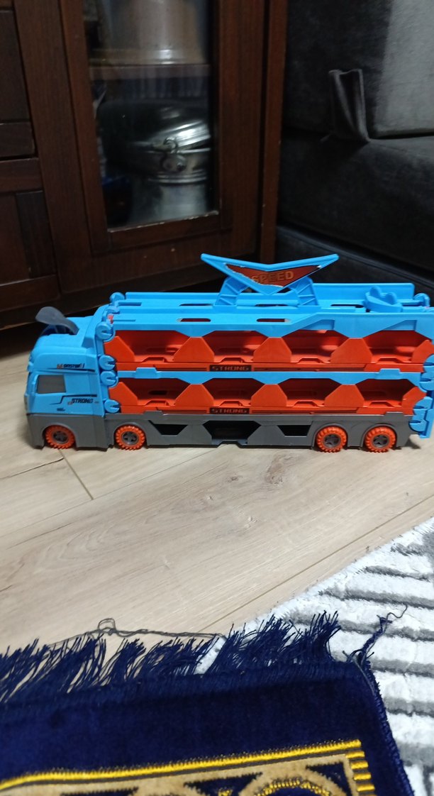 Koyu mavi renkte, çoklu turuncu bölmeli ve detaylı tekerlekli oyuncak kamyon. O gördüğünüz katların hepsi açılıyor 5 bunların hepsi açılıyor kadraja sığmadigi için açmadım