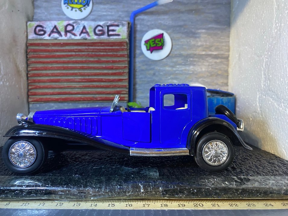 Mavi renkli oyuncak klasik araba modeli, detaylı tekerleklere ve canlı renklere sahiptir. Arka planda 'RAGE' ve 'YES' yazılı renkli tabelalar bulunur.