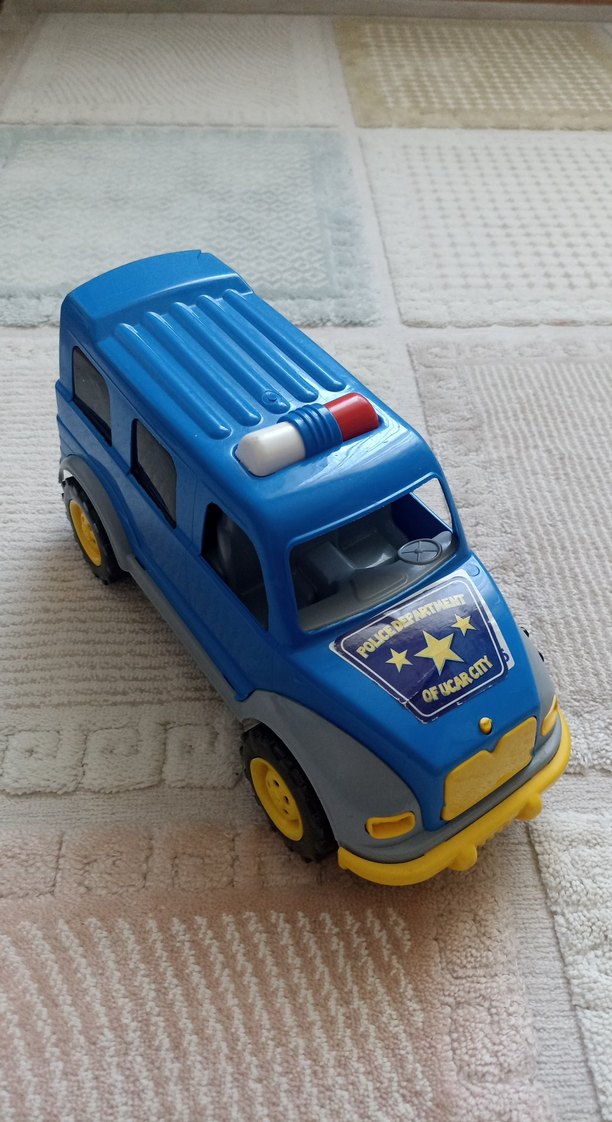 Mavi oyuncak polis arabası, renkli detaylara ve tekerleklere sahip. Dayanıklı plastikten yapılmıştır.