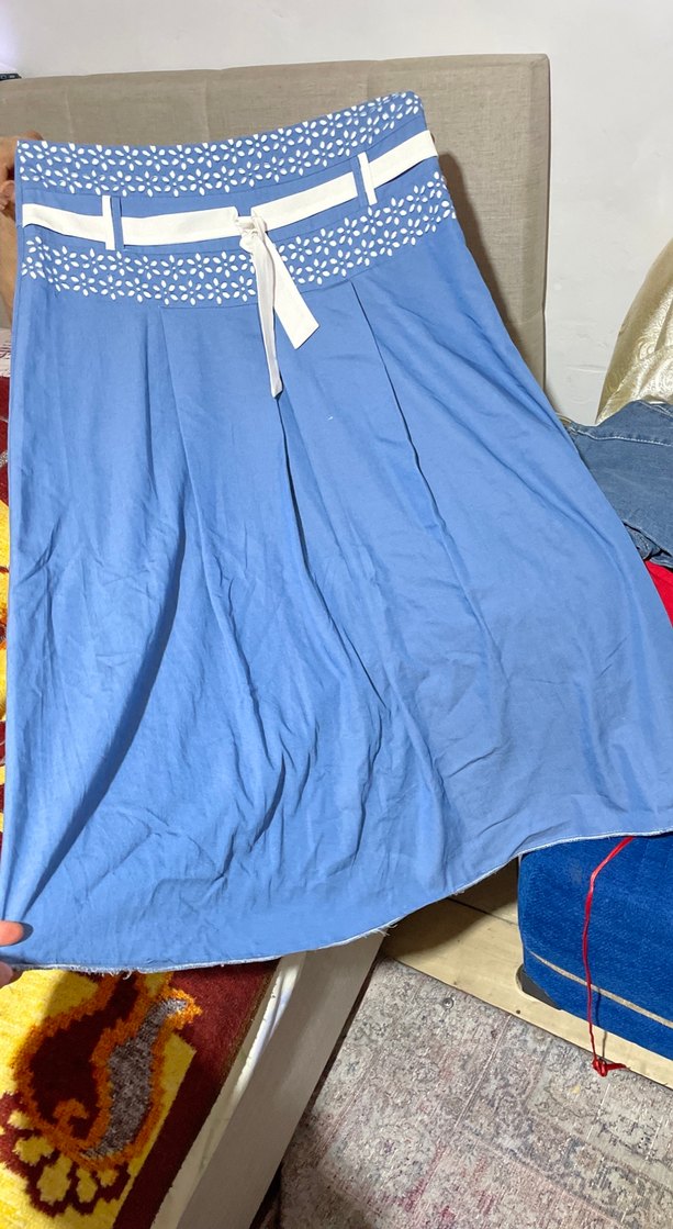 Mavi pamuk midi etek, drapeli ve bol kesim. Beyaz kemer detaylı, bohem tarz için uygun, günlük kullanıma uygun.