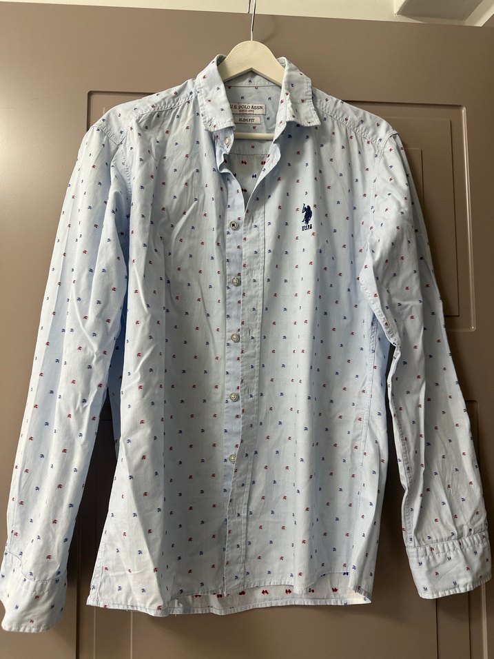 Pamuk kumaştan, baskılı ve pastel mavi renkte erkek gömlek. Düğmeli, uzun kollu ve yakalı, rahat kesimiyle günlük sokak stiline uygun. Kolunda fotoğrafta koyduğum şekilde beyaz bir leke var ama katlanınca hiç gözükmüyor.