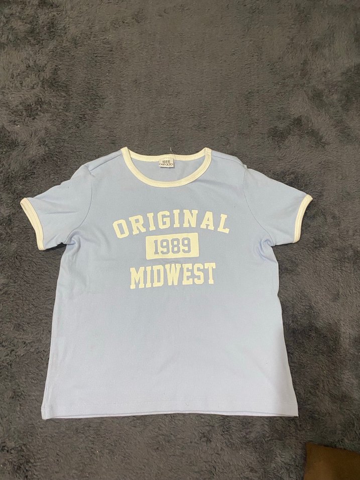 Mavi pamuklu tişört, kısa kollu ve yuvarlak yaka tasarıma sahiptir. Pastel tonlarda, 'MIDWEST 1989 ORIGINAL' baskılıdır. Rahat kesimi günlük kullanıma uygundur. Hiç giyilmedi