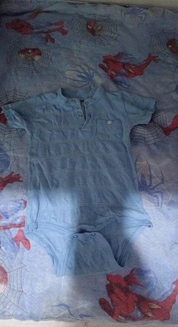 Pastel mavi renkte, pamuklu kısa kollu bebek body. V yakalı ve düğmeli, rahat sokak stili.
