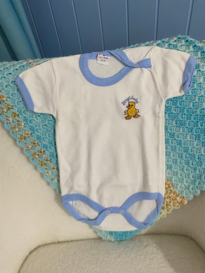 Pastel mavi renkli, kısa kollu ve yuvarlak yakalı bebek erkek body. Yumuşak pamuktan üretilmiş, düğmeli ve nakışlı ördek deseni bulunur.