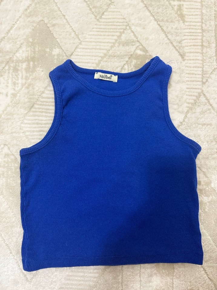 Pamuklu kumaştan yapılmış, mavi renkte, kolsuz ve straplez kadın atlet. Günlük kullanım için uygun, rahat ve şık bir tasarım sunar.