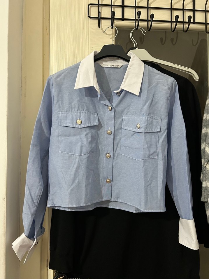 Mavi Pamuklu Düğmeli Kadın Gömlek