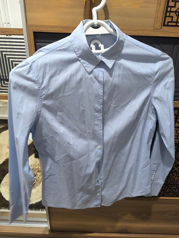 Mavi Pamuklu Düğmeli Uzun Kollu Kadın Gömlek