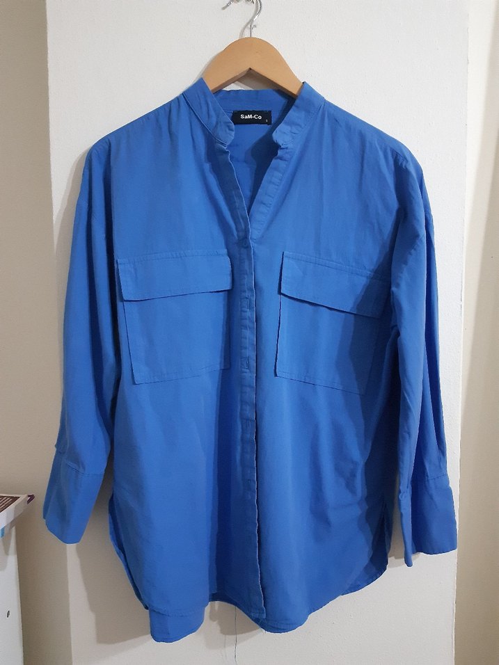 Mavi Pamuklu Düğmeli Uzun Kollu Kadın Gömlek