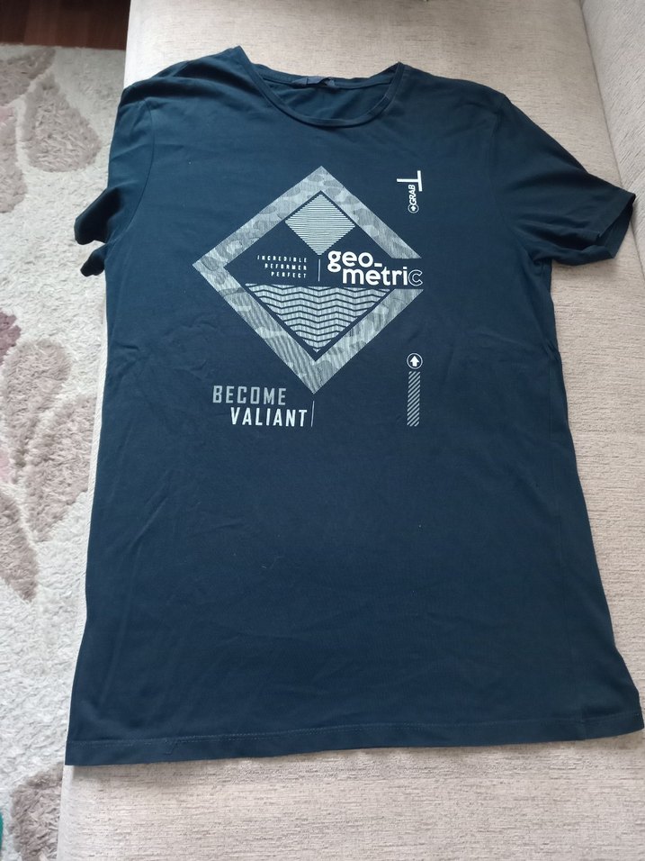 Pamuklu kumaştan, kısa kollu ve yuvarlak yaka, lacivert renk baskılı erkek tişört.
