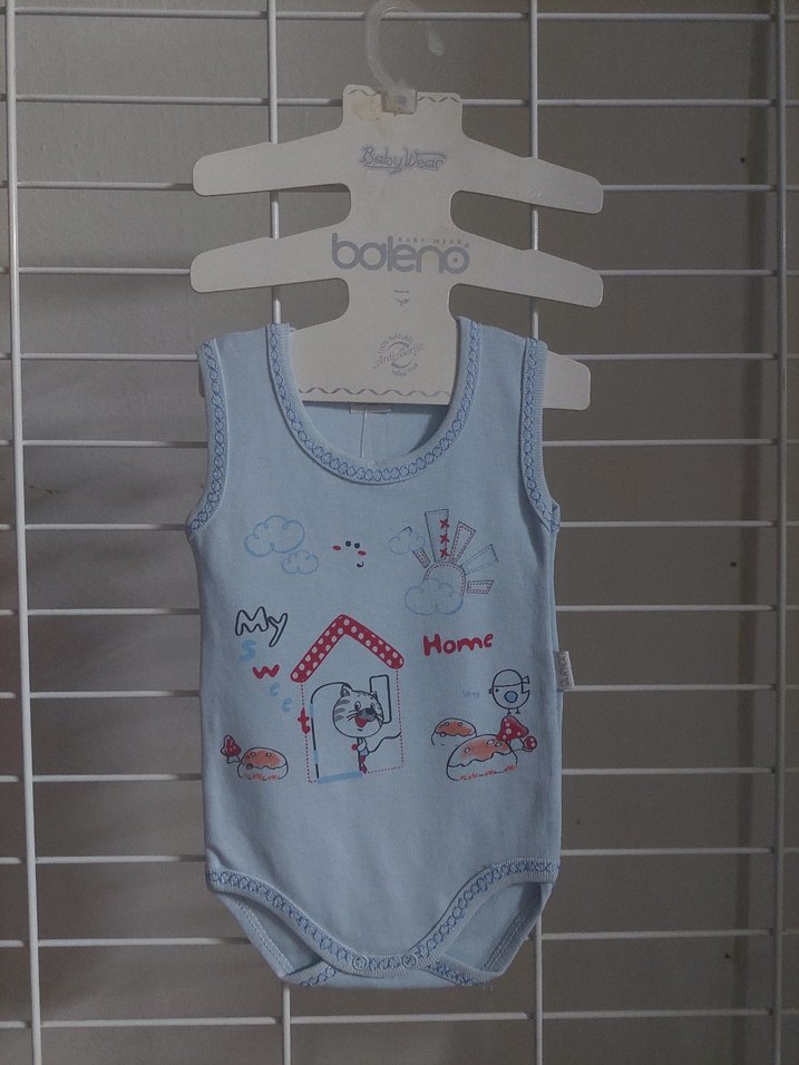 Mavi renkli, pamuklu, kolsuz bebek body. Yuvarlak yaka, ev temalı baskı ve örgü detaylara sahip, sokak stiline uygun.1 aylık.Toptan fiyatına satıyorum.