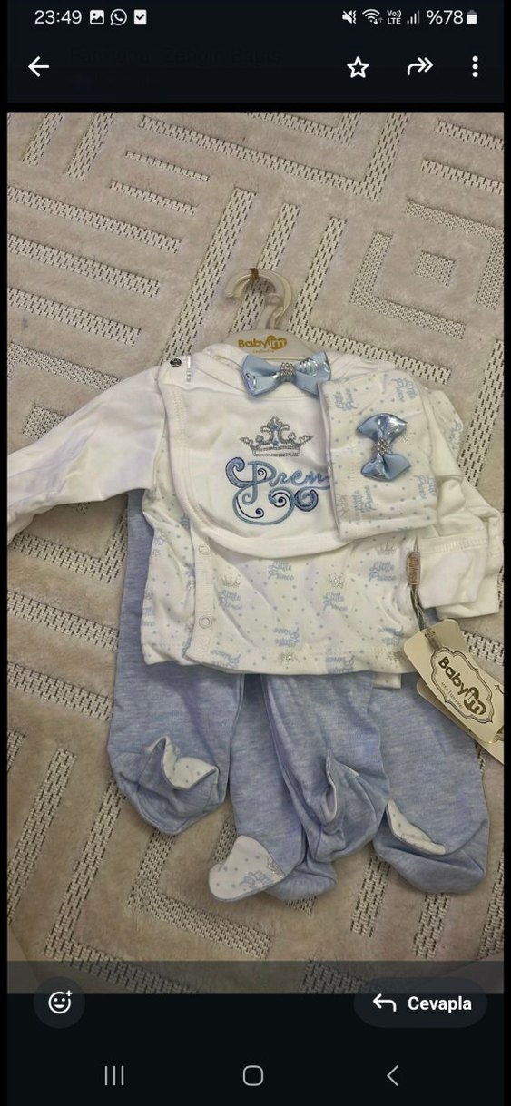Uzun kollu, pamuklu ve baskılı desene sahip, dantel detaylı mavi-gri erkek bebek hastane kıyafeti. Önlük ve uyumlu pantolon içerir.