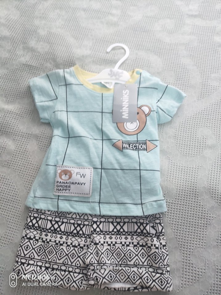 Pamuklu, kısa kollu, mavi renkli, baskılı ve örme detaylı erkek bebek takım. Üstü bisiklet yaka, altı desenli şortlu set.