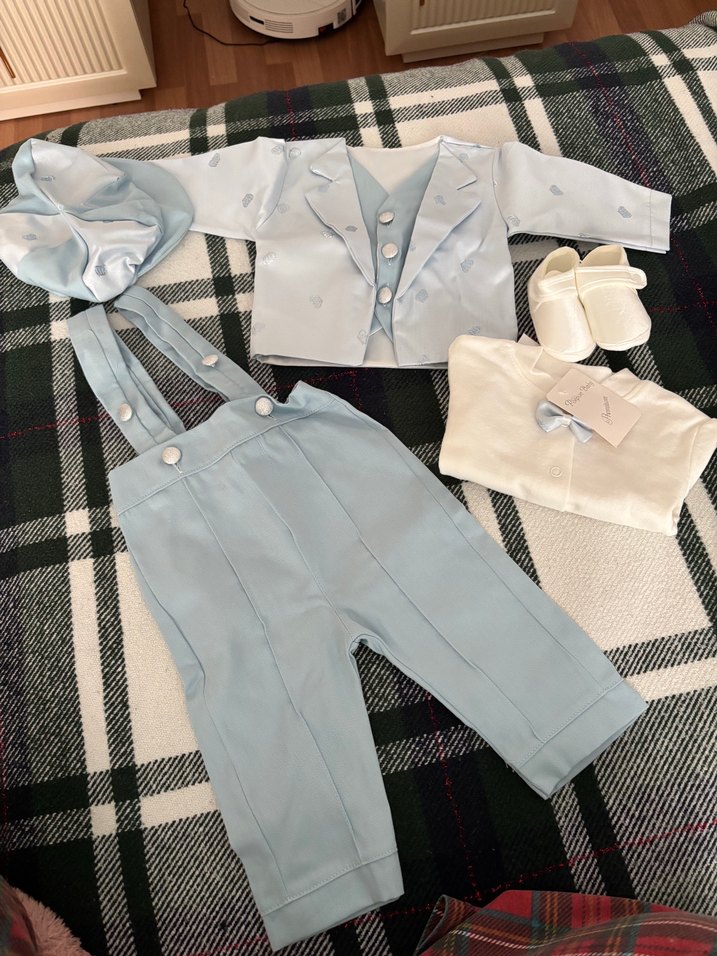 Mavi pamuklu kumaştan, nakışlı detaylı düğmeli ceket, askılı pantolon, şapka ve beyaz ayakkabılardan oluşan erkek bebek Mevlüt takım sıfır hiç kullanılmadı kutusula beraber göndereceğim etiketi üzerinde duruyor