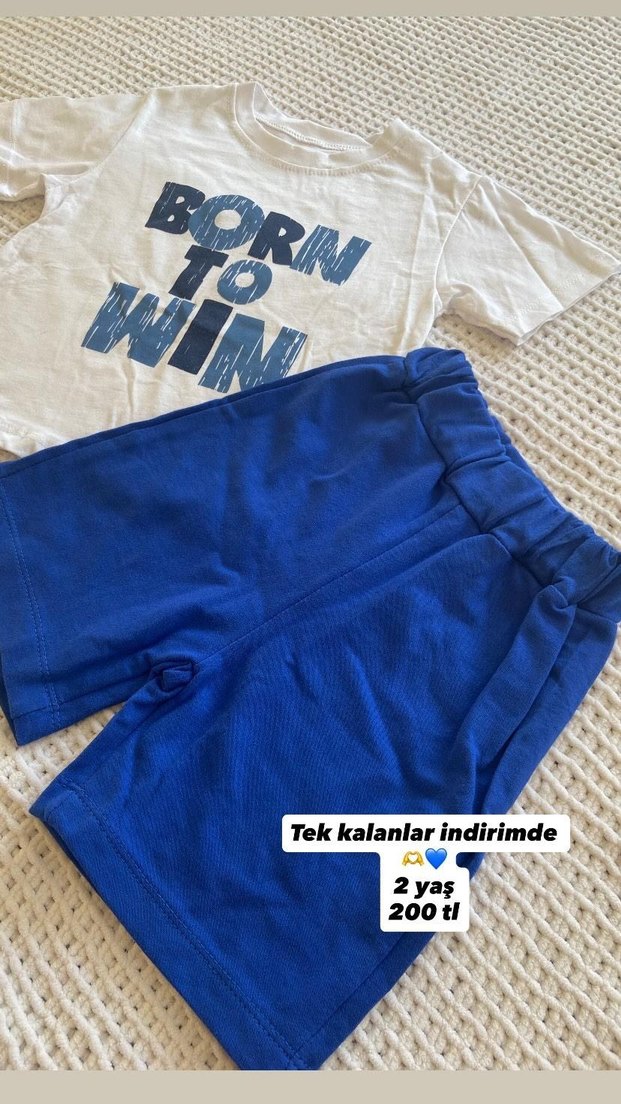 Mavi pamuklu erkek bebek takımı, kısa kollu, 'Born to Win' baskılı, yuvarlak yaka ve örgü detaylı. 2 yaş.