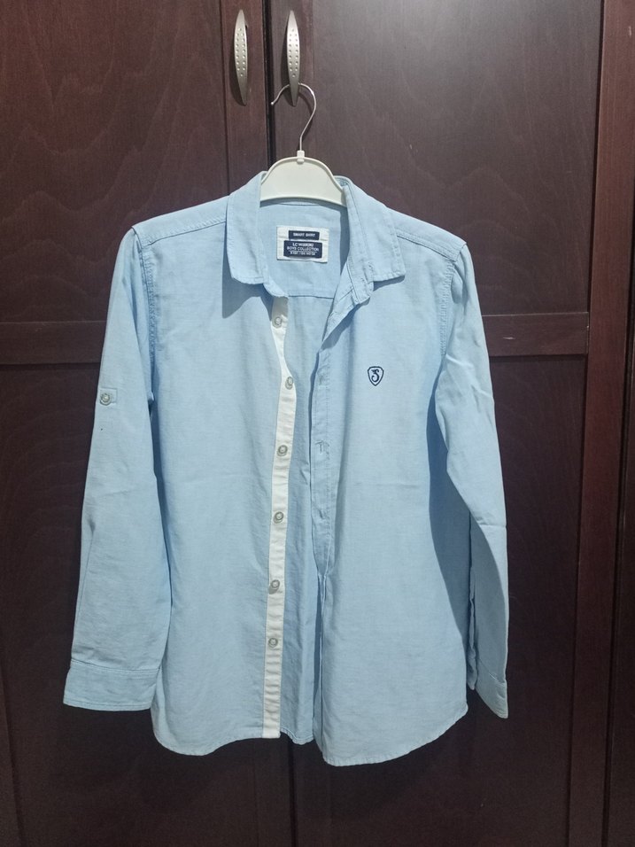 Pamuklu, uzun kollu, düğmeli ve normal boyda mavi erkek gömleği. Notch yaka ve rahat kalıp ile gündelik sokak stili için uygundur. Sadece bir kez giyildi temizdir ve hiçbir deforme yoktur.