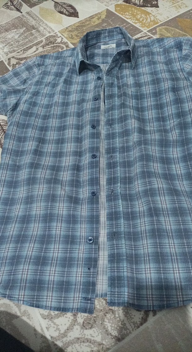 Düğmeli, kısa kollu ve yakalı erkek gömleği. Pamuklu kumaştan üretilmiş, bol kesim ve mavi-gri ekoseli desende, rahat sokak stili için uygun.
