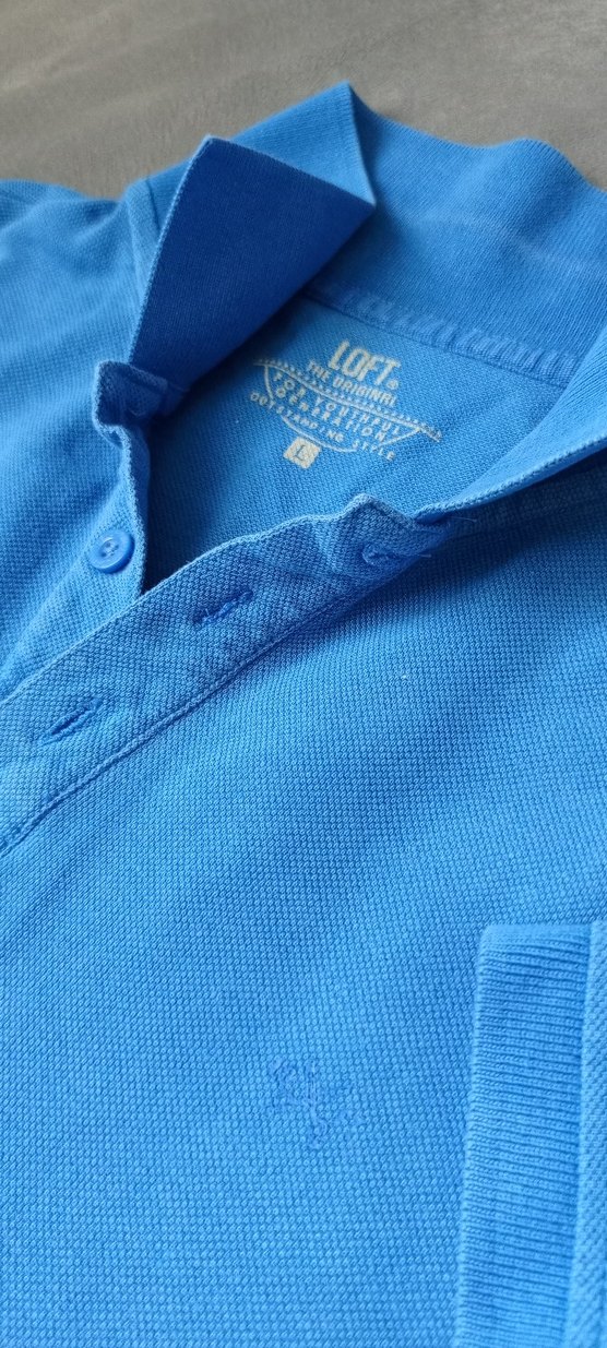 Düğmeli, yakalı ve kısa kollu erkek polo tişörtü. Pamuklu kumaştan, normal boy ve regular kesim. Canlı mavi renkte, desen yok. LOFT marka.