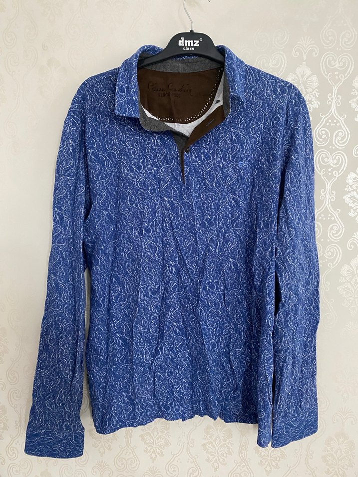 Erkekler için mavi pamuklu gömlek, uzun kollu ve yakalıdır. Gevşek kesimi ve düğmeli tasarımıyla günlük sokak stili için uygundur.