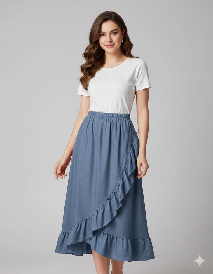 Mavi pamuklu midi etek, fırfır detayları ve bol kesimiyle rahat bir görünüm sunar. Günlük kullanıma uygundur. Fırfırlı etek Kumaş ince bı keten Uzunluk 97 cm Bel standart 36 dan 42 ye kadar giyilir Not. Tesettüre uygundur