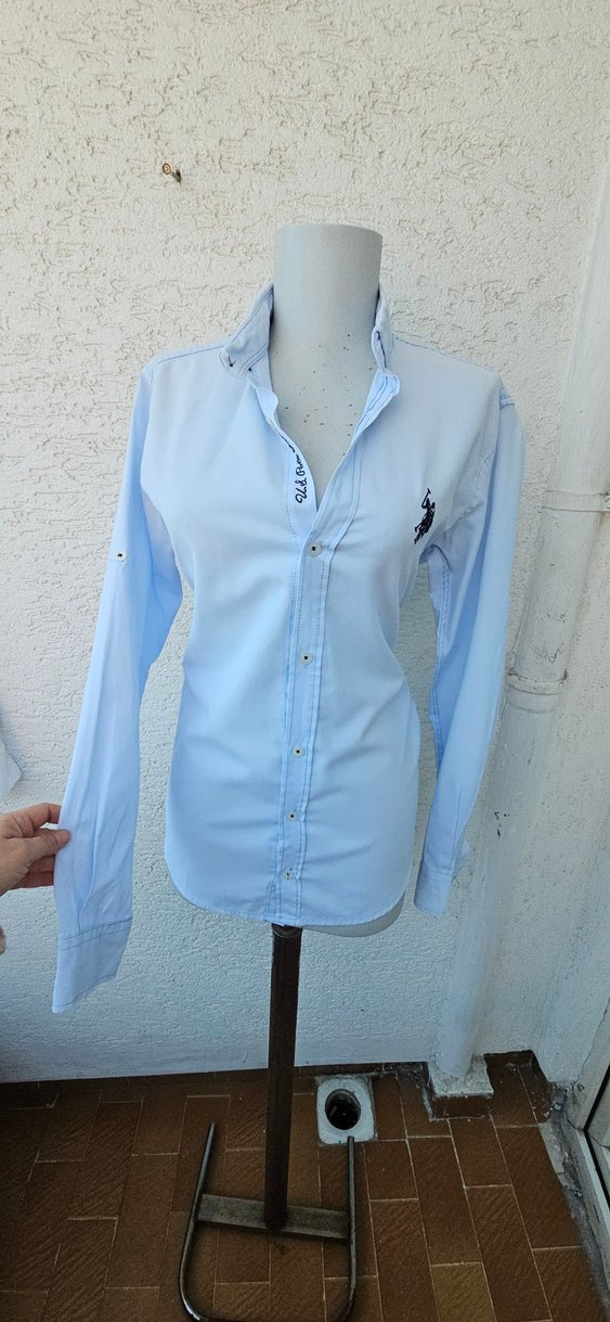 Mavi pamuklu kumaştan, düğmeli ve uzun kollu kadın gömleği. Normal kesim ve yakalı, günlük sokak stili için uygundur. ölçüleri resimlerde mevcut yepyenidir