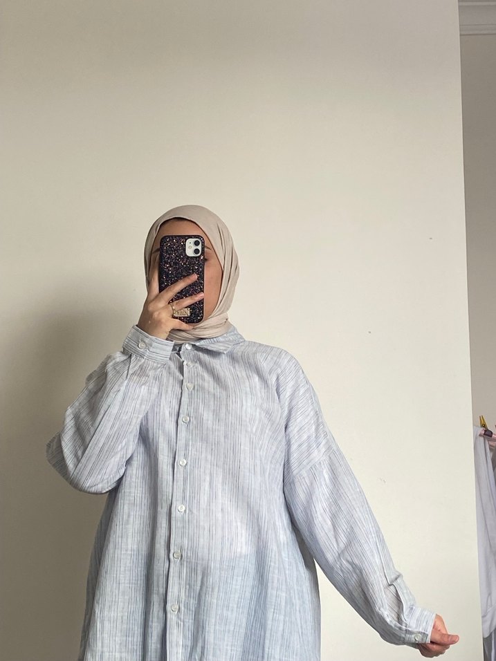 Geniş kesim, uzun kollu ve yakalı kadın gömleği. Yarı şeffaf keten kumaştan, gri tonlarda hafif batik deseniyle günlük kullanıma uygun.