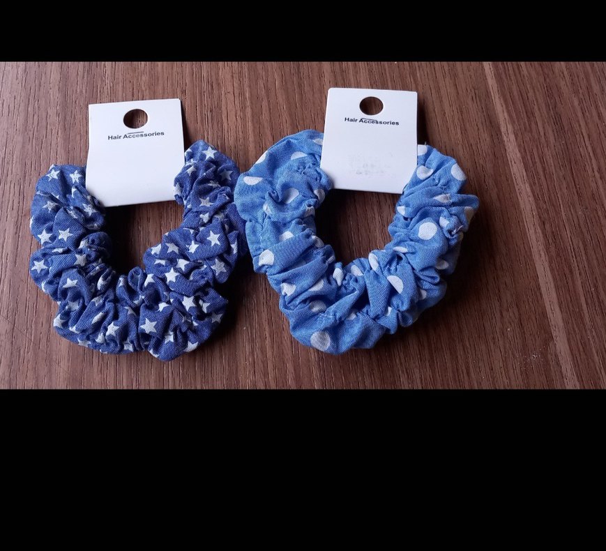 Yıldız ve puantiye desenli, lastikli mavi pamuklu iki adet saç tokası seti. Bohem tarzına uygun.