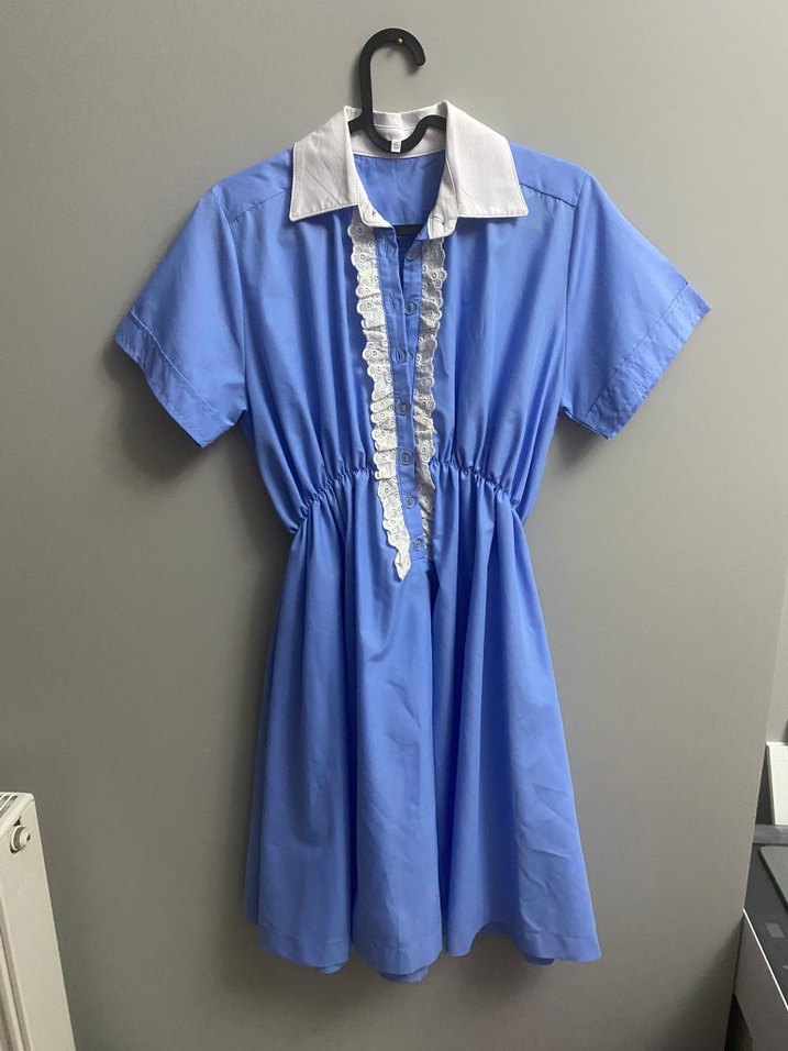 Mavi pamuklu midi elbise, kısa kollu, yakalı ve önde fırfır detaylı, rahat kesimli günlük giyim için uygun.