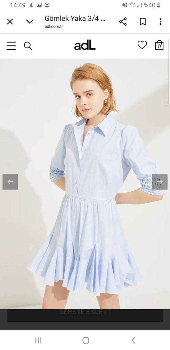 Mavi pamuklu mini elbise, kısa kollu ve dantel detaylı, eteği volanlı. V yaka ve yakalı, tertemiz. utüleyecek vaktim olmadigi icin bu sekilde ekledim. bir kac kez giyildim adil isik marka.