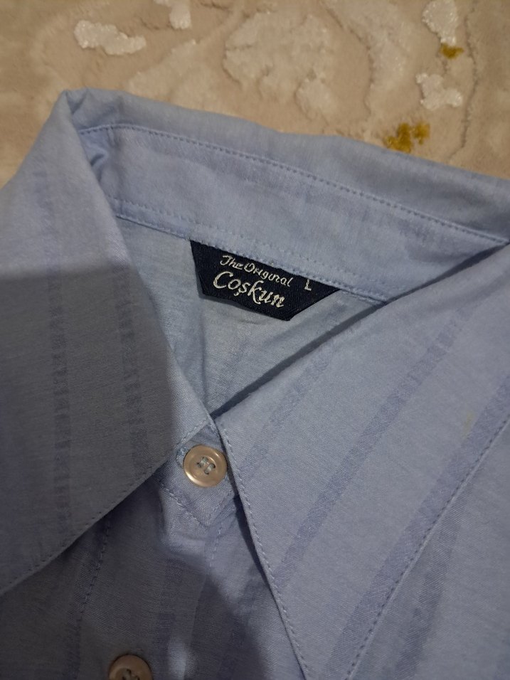 Pamuklu kumaştan, düğmeli, yakalı, kısa kollu ve normal kesim erkek gömleği. Mavi renkte, günlük kullanım için uygundur.