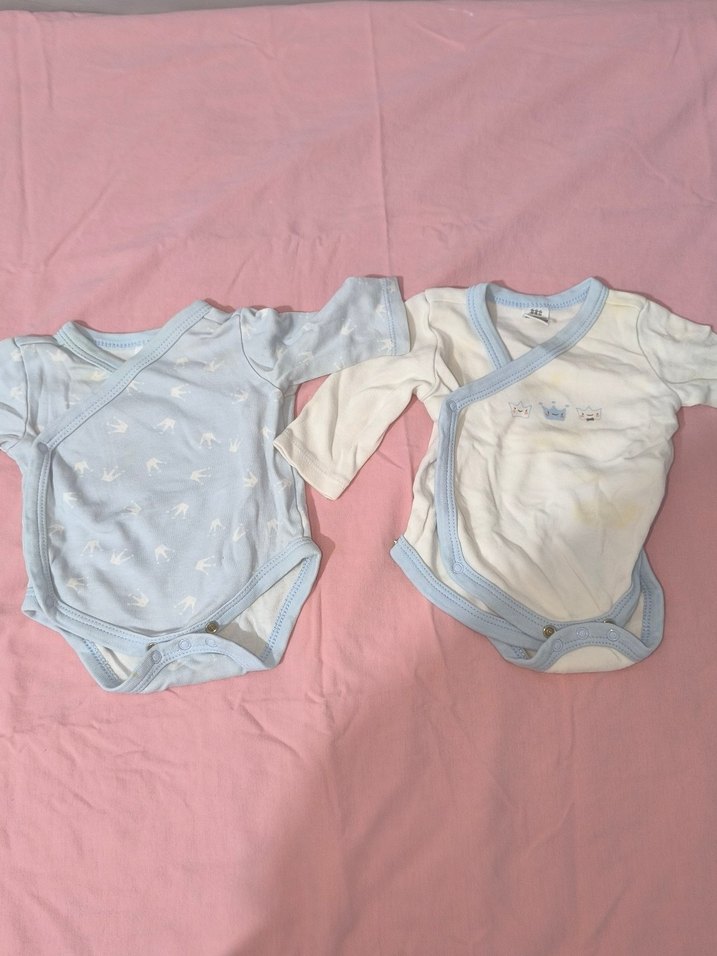 Pastel mavi renkli, uzun kollu ve straplez yakalı pamuklu bebek body. Desensiz, rahat ve şık bir tasarım sunar. birinde hafif leke var