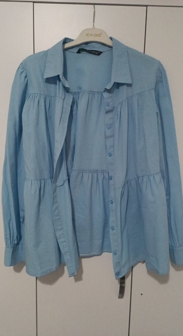 Bu bol kesim, düğmeli gömlek, yakalı ve uzun kolludur. Yumuşak keten kumaştan yapılmış olup, pastel mavi renktedir. Midi boyu ve bohem tarzı günlük kullanıma uygundur.