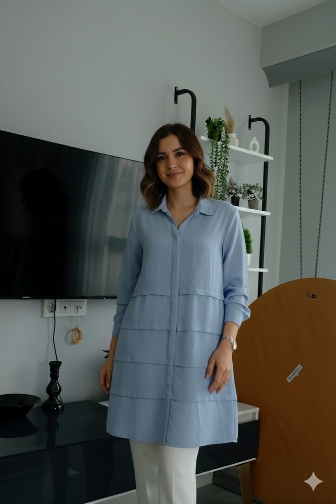 Bu mavi pamuklu gömlek elbise, uzun kollu, yakalı ve düğmeli tasarıma sahiptir. Midi boyu ve bol kesimiyle günlük kullanıma uygundur. ikikol 61 boyu 95 bı iki sefer giyildi deformesi yoktur