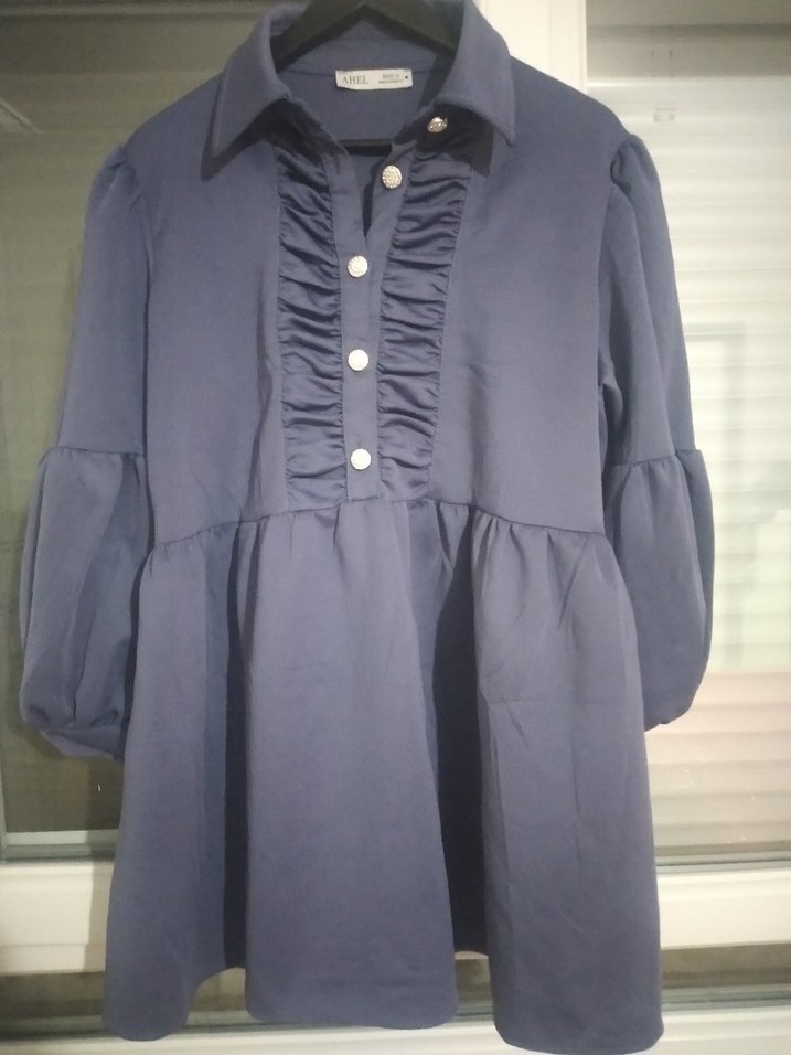 Mavi pamuklu tunik elbise uzun kollu ve yakalıdır. Ön kısmında fırfır detayları bulunur, bol kesim ve midi boydadır. Günlük kullanıma uygundur.