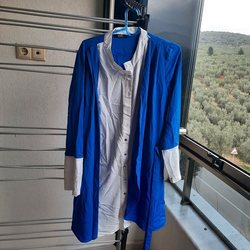 Pamuklu kumaştan yapılmış, mavi ve gri renklerde uzun, salaş kesim ceket. Notlu yaka ve drapeli detaylarla günlük rahat kullanım için uygundur.