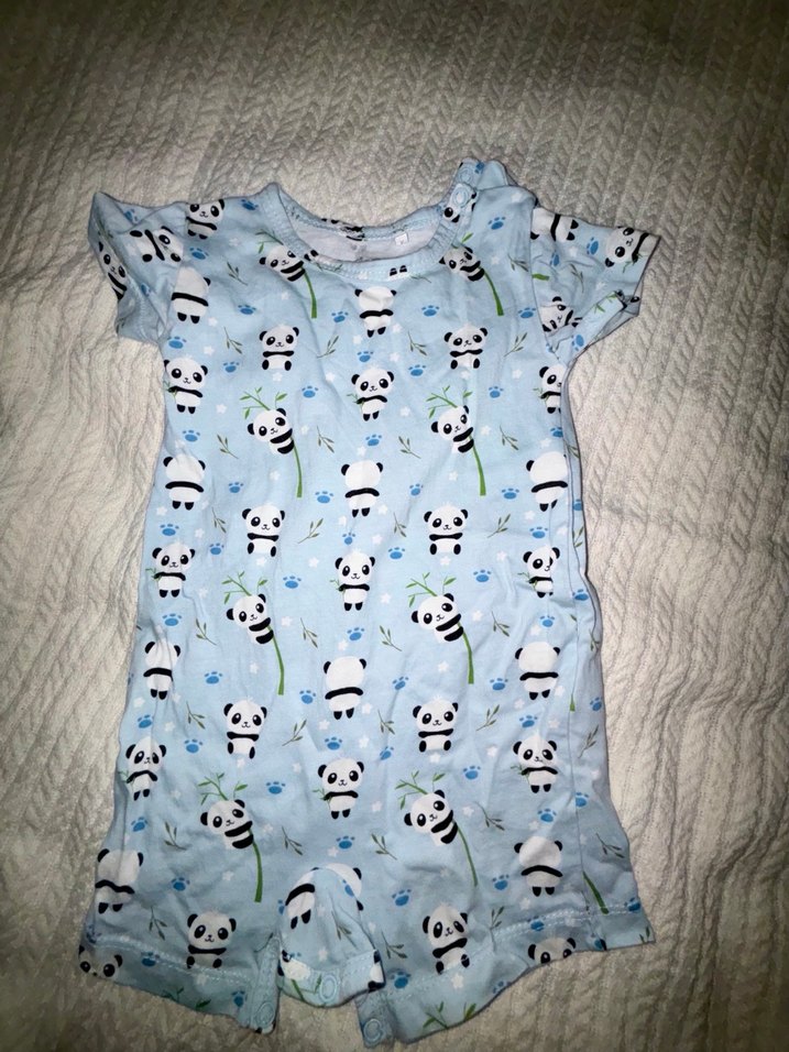 Mavi renkli, kısa kollu ve bisiklet yaka erkek bebek tulumu, yumuşak örme pamuktan üretilmiş. Üzerinde sevimli panda baskıları bulunur. Hiç giyilmedi sapasağlam