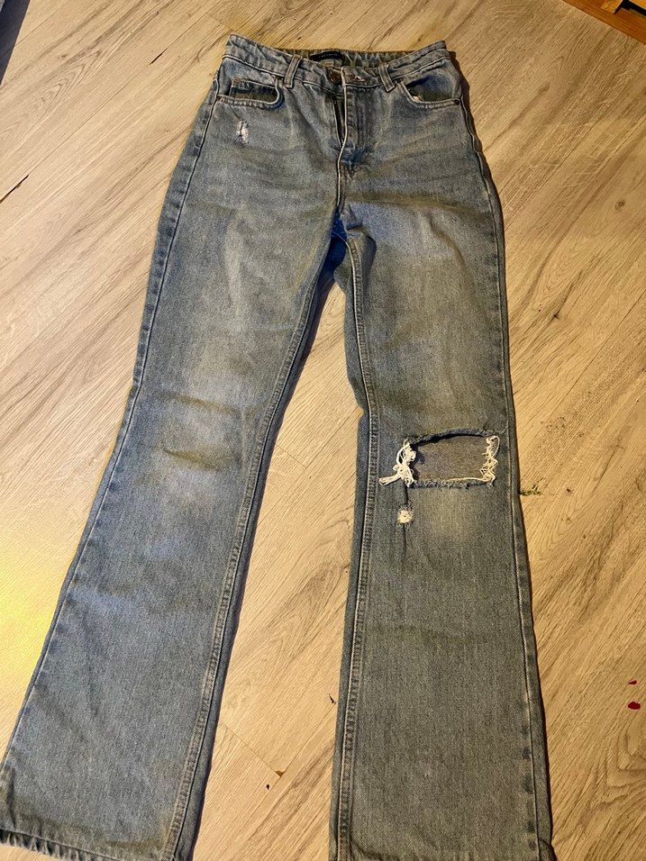 mavi pantolon paça kısmında sadece ufaktan ipler cözülmüştür