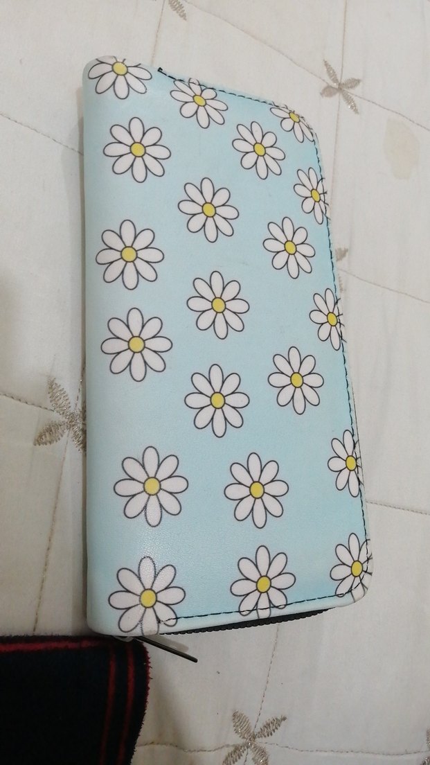 Sentetik kumaştan yapılmış, mavi renkte ve papatya desenli fermuarlı çocuk cüzdanı. Günlük kullanım için uygundur.