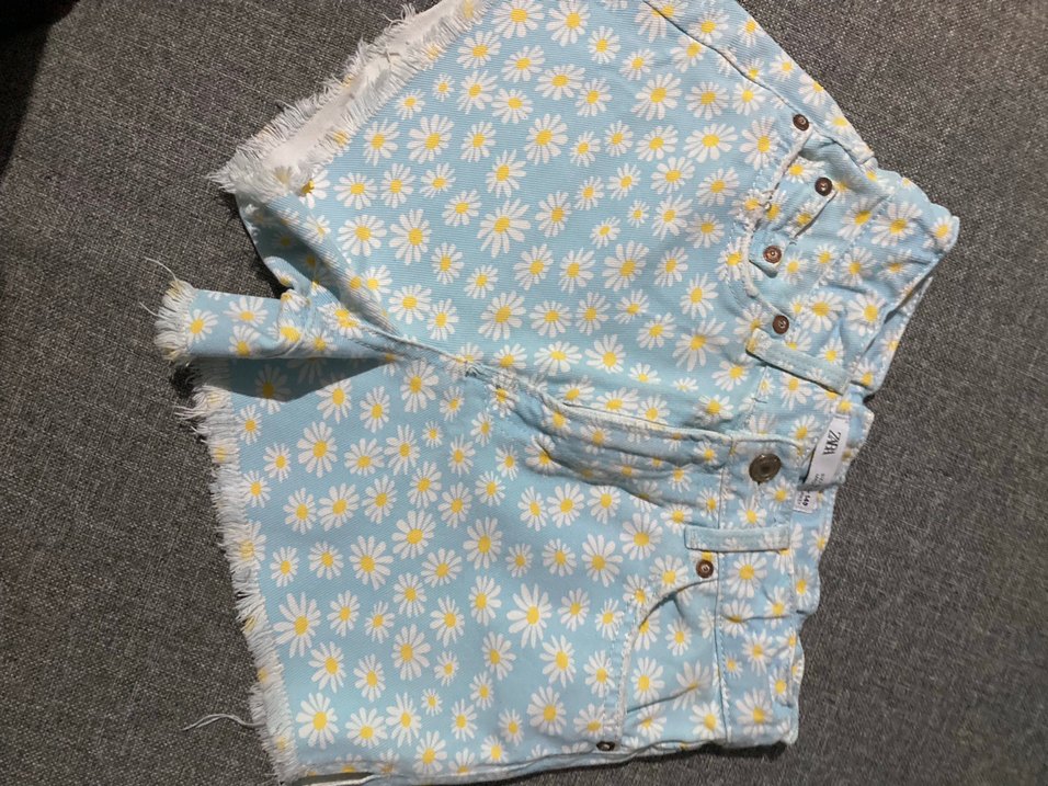 Pastel mavi renkte, beyaz papatya desenli, düğmeli ve bol kesim midi denim şort. Püsküllü kenarlarıyla vintage tarzda günlük kullanım için uygun.