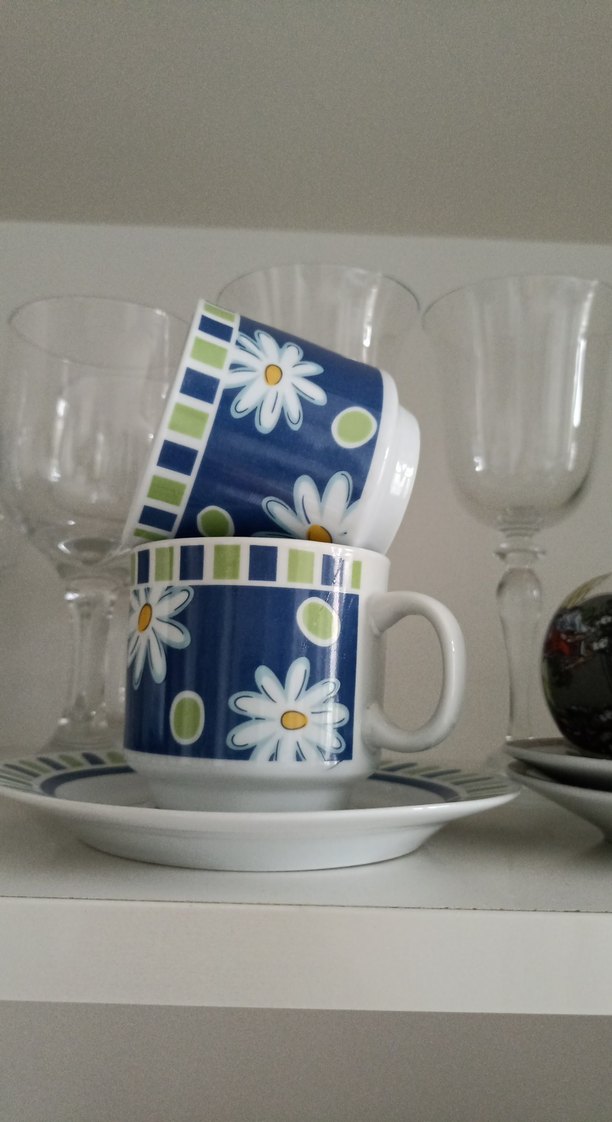 Mavi renkli, beyaz papatya desenli ve yeşil detaylı fincan seti, uyumlu tabaklarla birlikte sıcak içecekler için uygundur. ☕