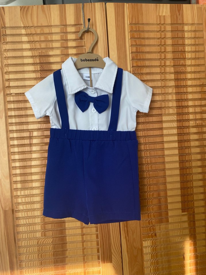 Gömlek ve kendinden askılı şortu bir takım kıyafet bir kere giydi papyonlu yazlık bir takım hiçbir deformesi yok pantolonunda görüldüğü gibi ek askı boyu uzatma deliği var rahat rahat üçüncü aydan altıncı aya kadar kullanıma açık esnek bir yapısı var  yurtdışından alınan bir ürün fiyatını çok makul tutuyorum