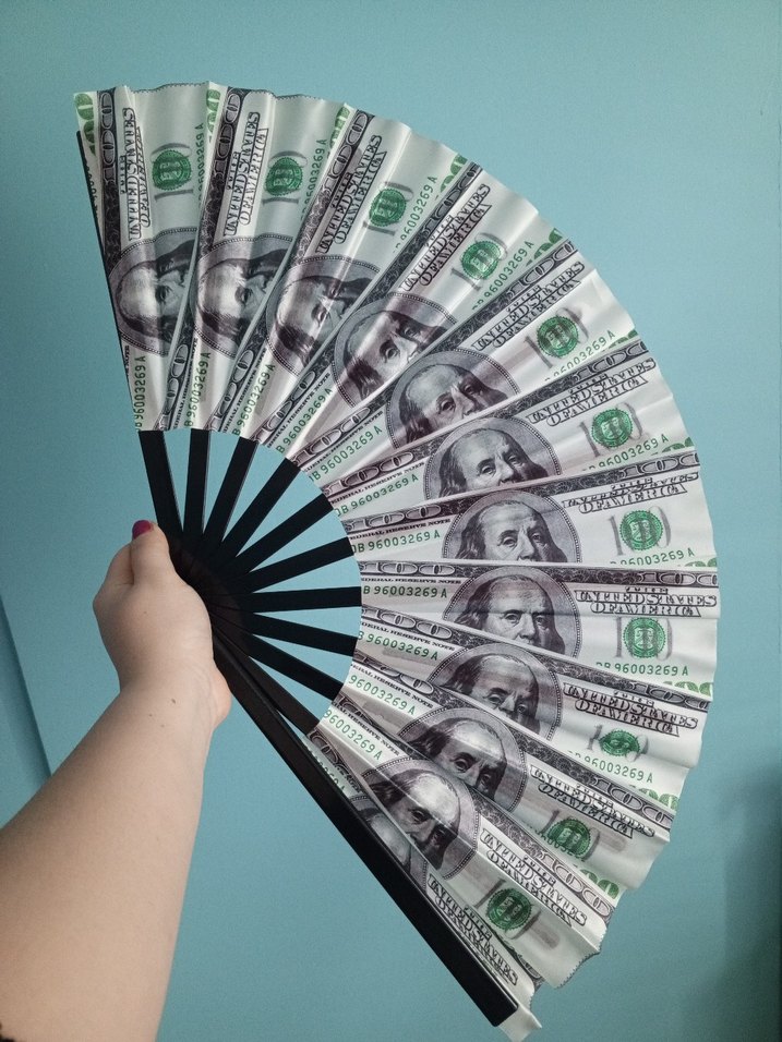 Mavi renkte ve siyah kemiklere sahip, ABD dolar banknotu desenli katlanabilir yelpaze. Hafif renklerle şık bir görünüme sahip.