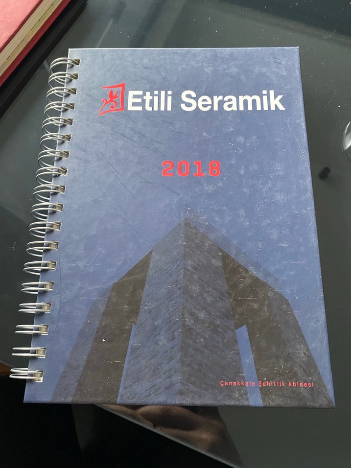 Parlak mavi kapaklı, spiral ciltli 2018 Etili Seramik planlayıcı. Üzerinde anıt görseli bulunmaktadır.