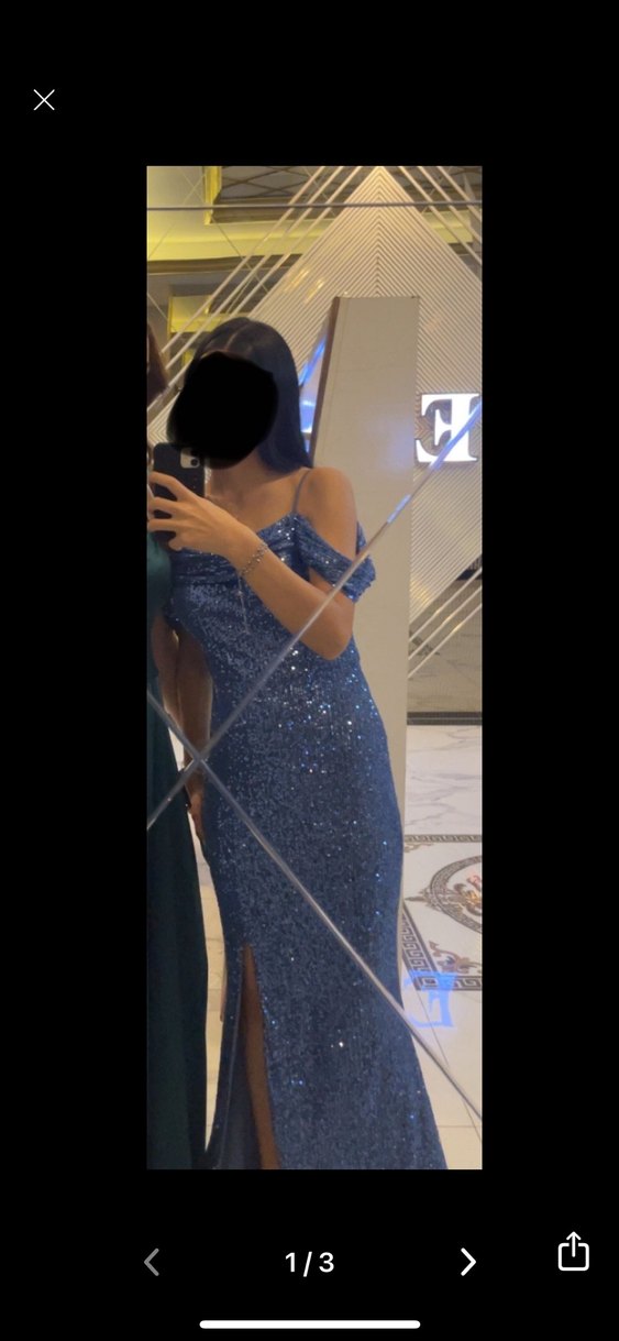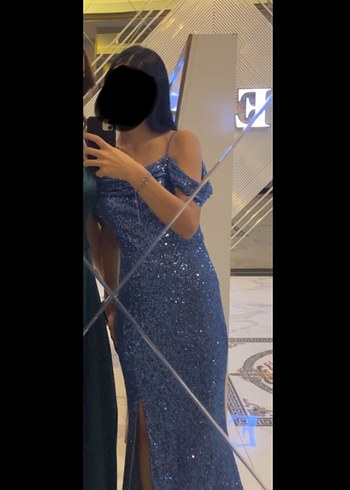 ince askılı, parlak simlerle kaplı mavi, vücuda oturan midi uzunlukta abiye elbise. Çağdaş tarzıyla parti için uygundur. ✨ sadece 1 kez giyildi. Defosu yoktur.