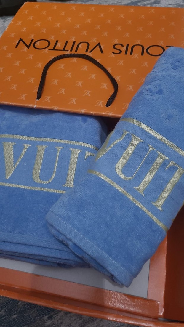 Mavi renkte, parlak baskılı ve "VUI" yazılı detaylara sahip havlu, kutusu ile birlikte sunulmaktadır. ikili Havlu Seti