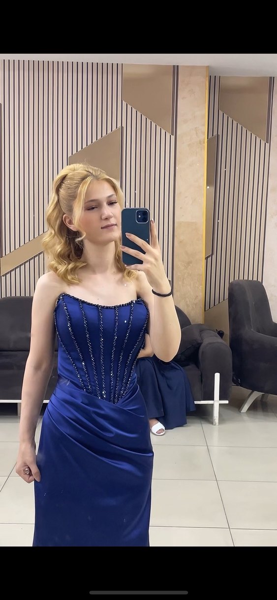 Parlak mavi kumaş ve boncuk detaylı, straplez, vücuda oturan midi abiye elbise, klasik zarafet için uygun. ✨ 1 kere giyildi elbise de hiç bir sorun yoktur gönül rahatlığıyla alabilirsiniz