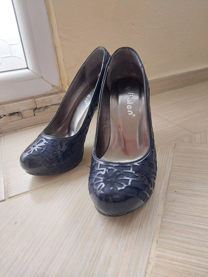 Mavi parlak çiçek desenli, kauçuk malzemeden yapılmış stiletto topuklular. Klasik gotik tarzda, romantik buluşmalar için uygun.