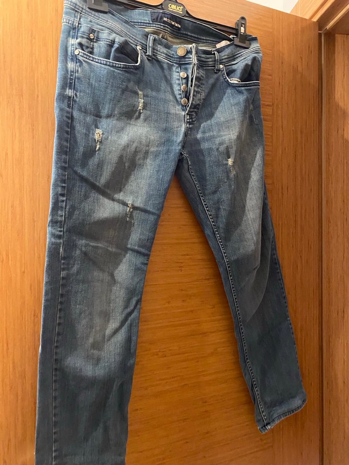 Mavi parlak denim kumaştan, orta boy ve düzenli kesim olan, tokalı detaylı erkek jean.